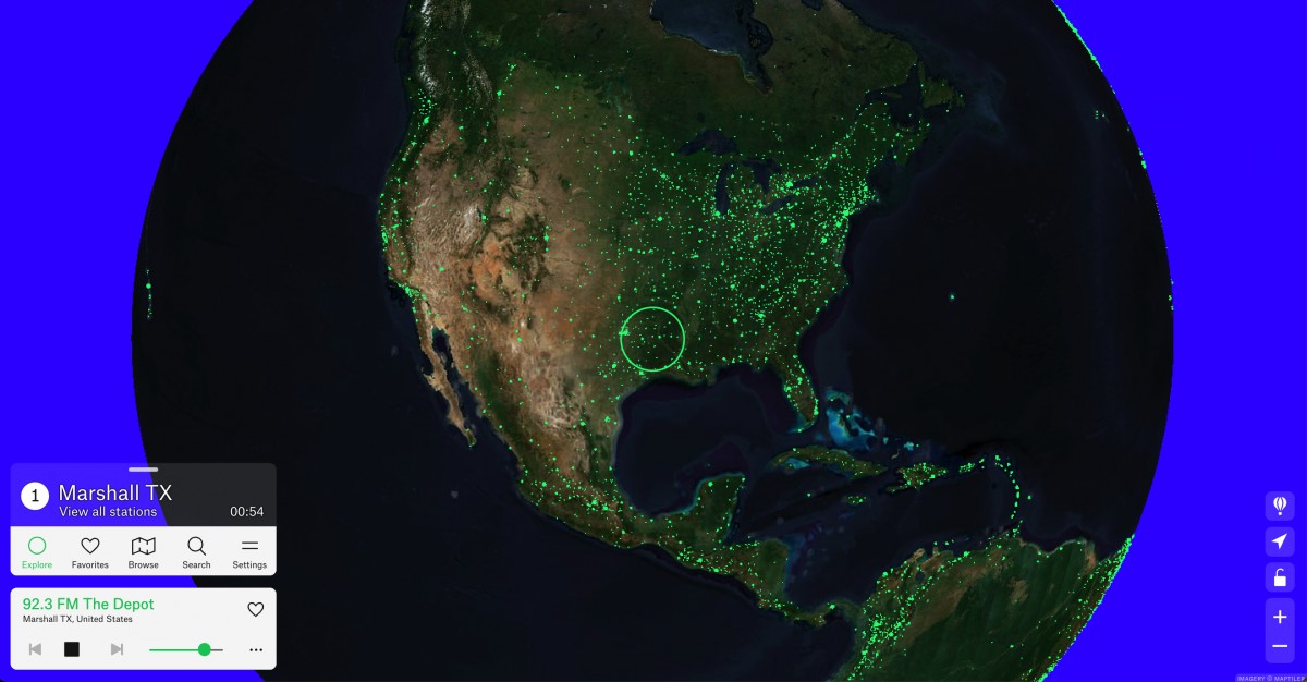 ラジオ局のある場所を示しており、そこを選ぶといま流れているものを聴けます。